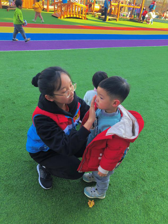 其实刚开始的时候,大概因为我是一个新老师,所以小朋友们都不会和我很亲近,甚至很多时候也不会听我说的话,心里是有些失落的。随着慢慢相处过后,他们便会开始和我分享一些幼儿园外遇到的事情,比如爸爸妈妈带他去公园玩了蹦蹦床,假期去坐了火车,舅舅给她买了新鞋子……在活动区域玩的时候也会给我做一碗“蔬菜汤”,烤几串“烧烤”,搭积木时也会兴奋地和我讲自己搭的火车和飞机。记得有一次快要吃饭的时候一个小朋友就跑过来抱住我的腿,甜甜地叫我“小芳老师”,其他的小朋友也跟着叫起来,那一刻有些惊讶,但更多是满满的开心。