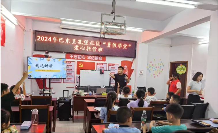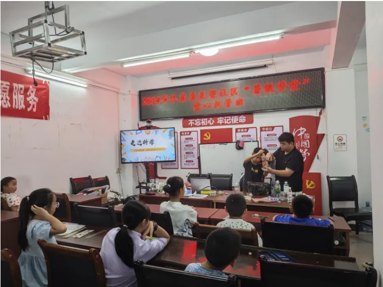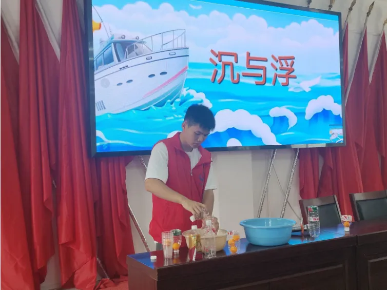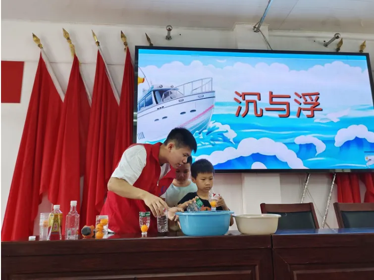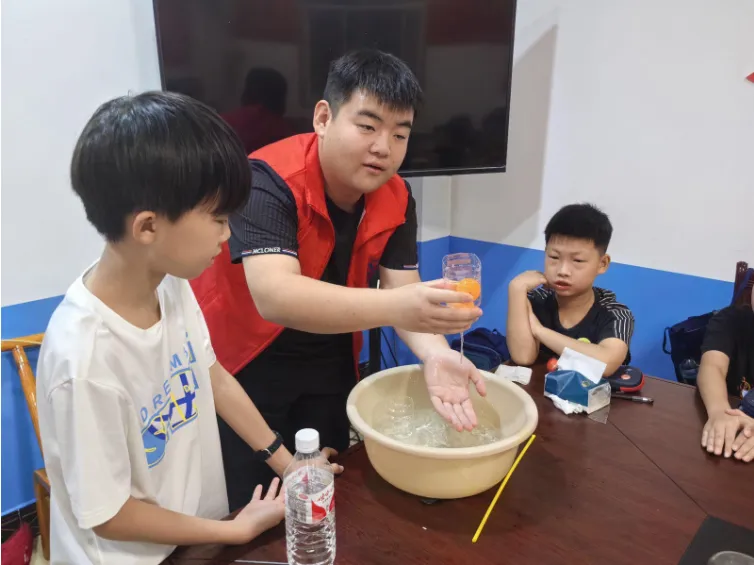 乒乓球为何能从水杯中突然弹出、用两根吸管和一个可乐瓶怎么做出简易饮水机、一张薄薄的纸怎么让水不从杯中流出?这一个个“反常”现象的背后蕴藏着的是一条条科学定理。2024年7月22日,“青衿之志”志愿服务队用生活中随处可见的物品,给沿渡河镇的小朋友们带来了一场科学探索之旅。