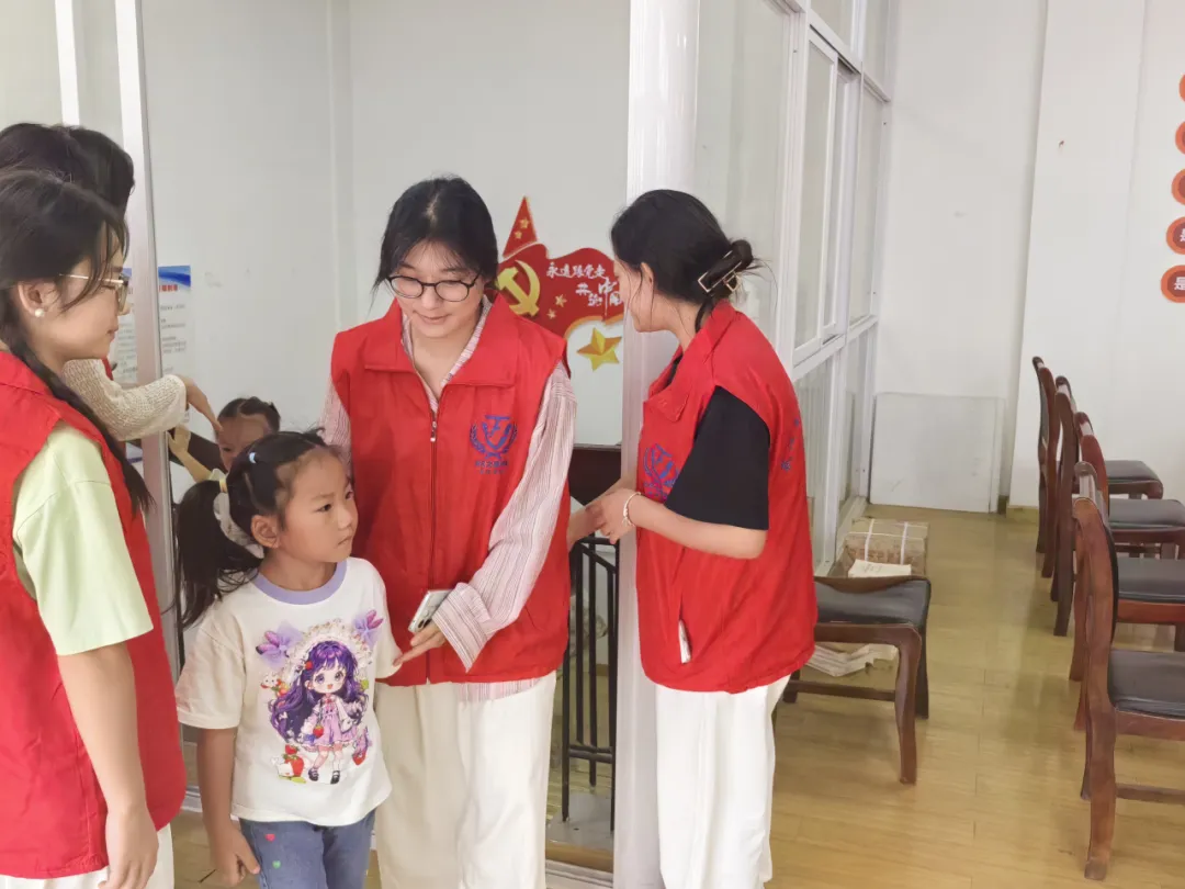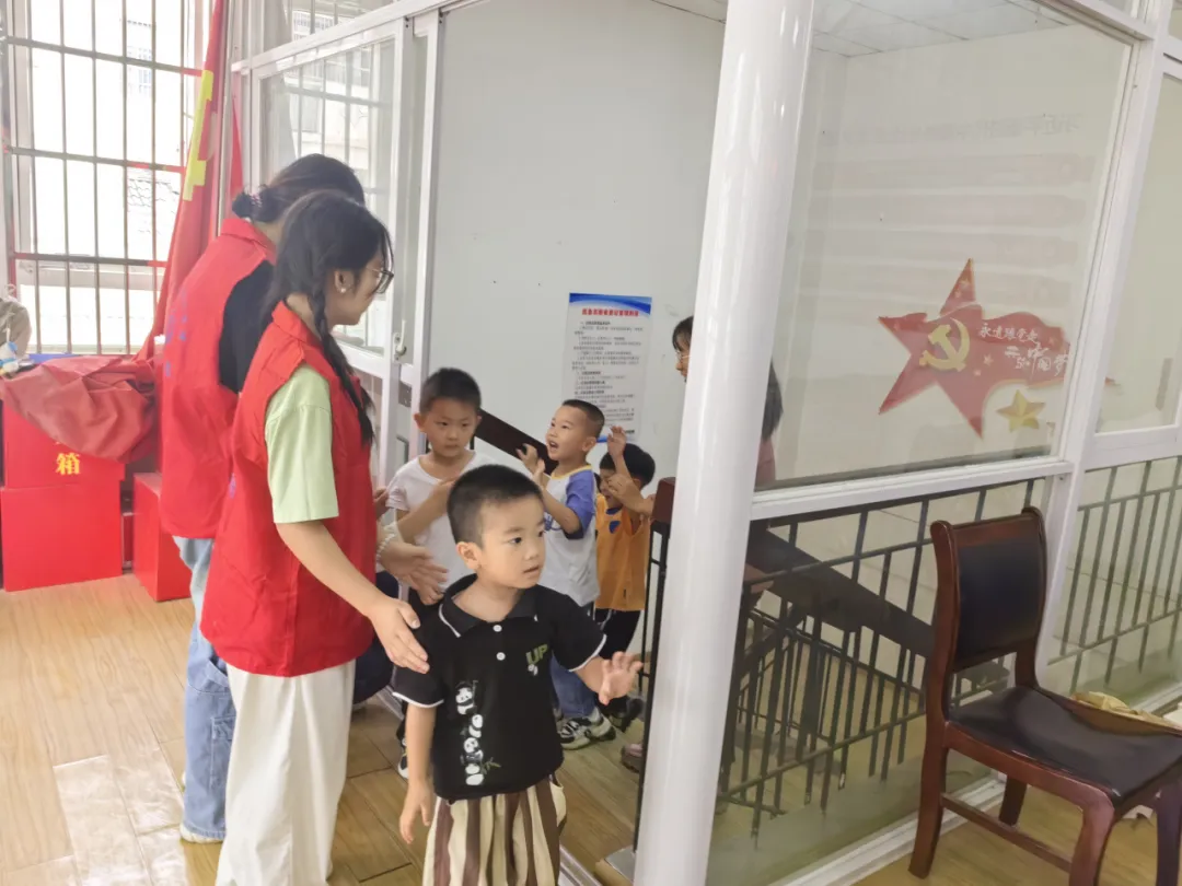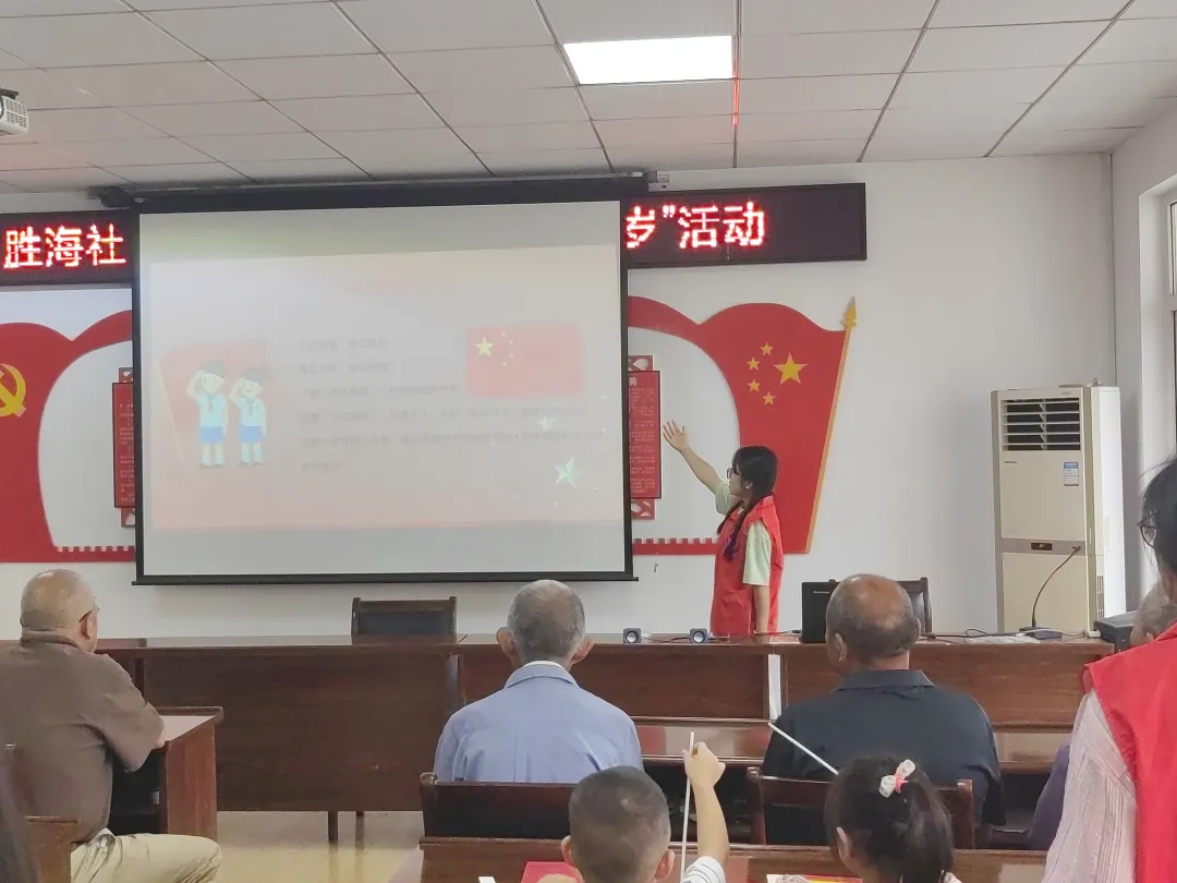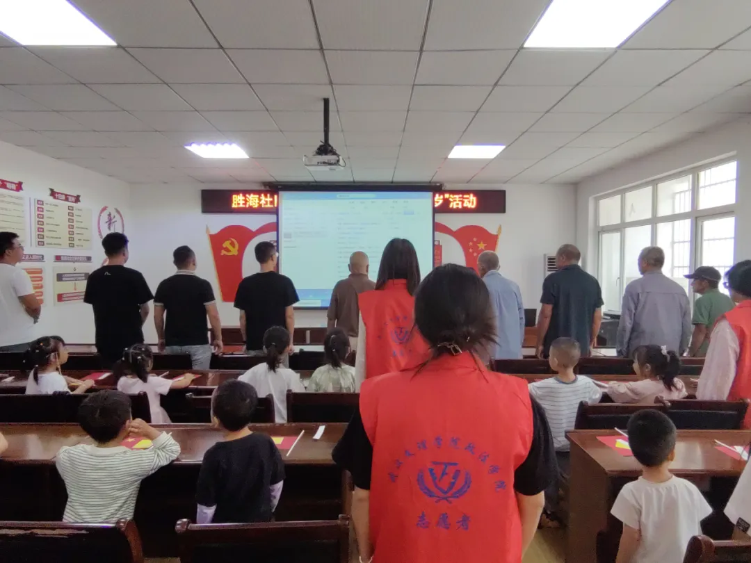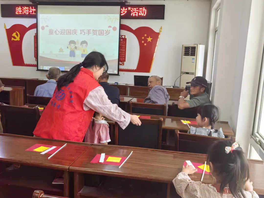 下午两点时分,志愿者们率先抵达胜海社区,引导党员同志们有序入场,为小朋友们分发手工材料。