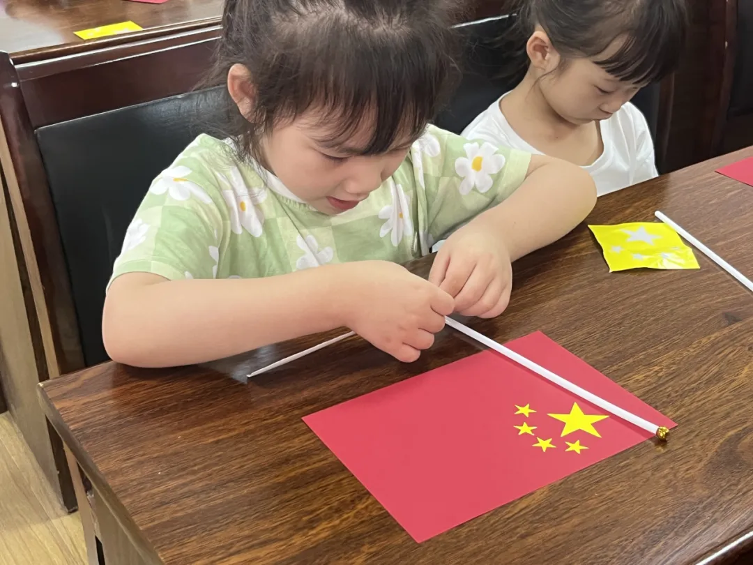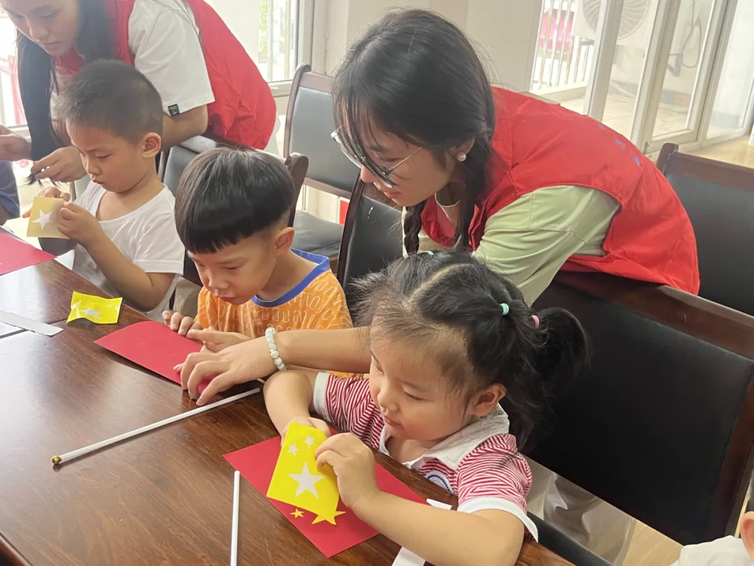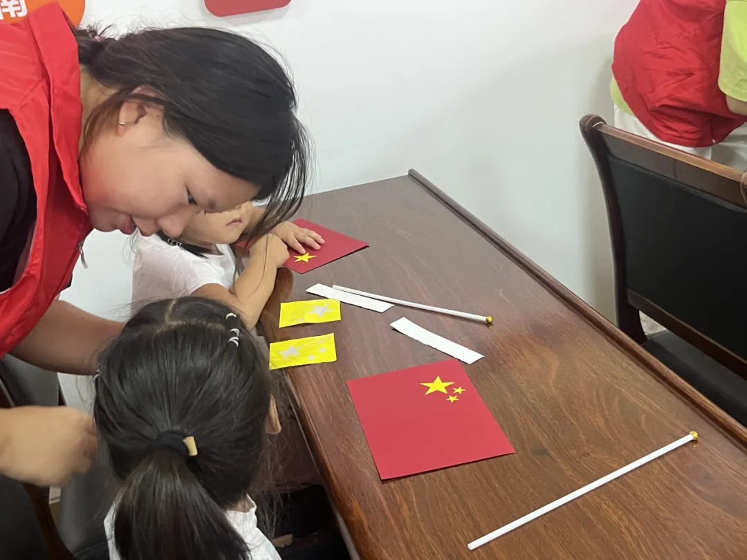 随后,小朋友们开始将桌上提前准备好的材料拼接成一面独属于自己的五星红旗。将红面铺开、贴上明黄色的大小五星、固定到白色直杆上,小朋友们全神贯注,志愿者同学们细心帮助,很快,一面面鲜艳的五星红旗从桌上“飘”了起来。