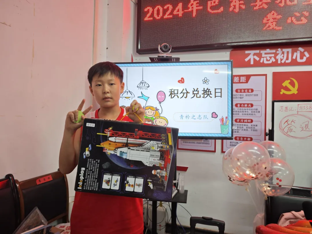 2024年7月29日,青衿之志志愿服务队为沿渡河镇暑期学堂的小朋友们开展了一场积分兑换活动。航天积木、水彩笔、小花盆、蝴蝶气球……桌子上堆满了可以用积分兑换的小礼物,小朋友们按照积分高低,分别兑换着自己喜欢的礼物,露出了开心的脸庞。