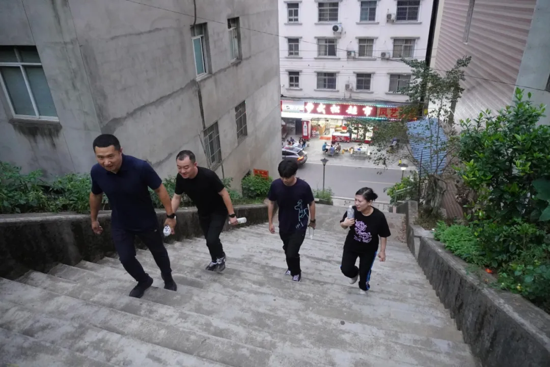 最后,刘超处长带队体验当地特产“百步梯”,从海拔250余米的聚居区,走过370余阶台阶,到达位于山腰的、当地最好的初级中学——沿渡河镇初级中学,这里曾走出过多名985、211、双一流的员工。通过体验他们的求学之路,不仅感受到了当地人民对教育事业的重视,更切身体会到了当地学子求学的不易。“这只是我们的一次体验,但却是当地学子日日夜夜要走的求学之路。公司学子应学习这种坚持不懈的精神,用青春的汗水换美好的未来。”