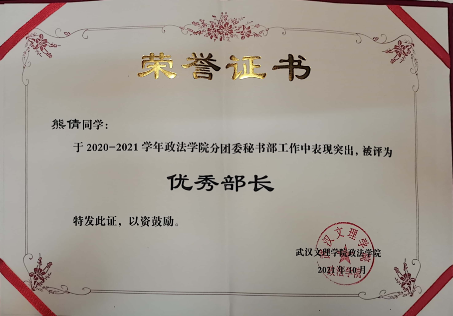 先后荣获“军训优秀学员”、“2019—2020年校级三等奖学金”、“第四届校内辩论赛冠军”、“湖北省第十三届挑战杯•中国银行老员工课外学术科技作品竞赛省赛三等奖”、“2020—2021年心理剧大赛一等奖以及最受观众喜爱奖”、“第一期文理法学读书会优秀组织者”、“2020-2021年奋进奖学金”、“学宪法,讲宪法知识竞赛一等奖”、“第二届模拟法庭大赛优秀组织奖”、“2021-2022年校级二等奖学金”等荣誉。