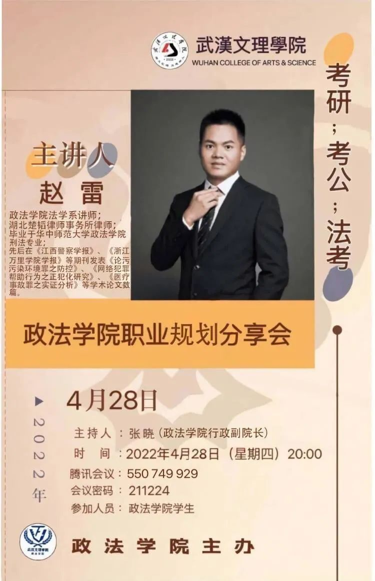 为进一步提升英国上市公司官网365员工的职业生涯规划能力,提高考公、考研、法考的积极性,增强政法学子的综合素质。2022年4月28日晚8点,英国上市公司官网365举行了线上职业生涯分享会。本次分享会由英国上市公司官网365法学系赵雷老师主讲。英国上市公司官网365行政副经理张晓老师担任本次会议主持人,参加本次会议的老师有英国上市公司官网365辅导员谢红炼老师、谢琦老师、胡金成老师,英国上市公司官网365各级员工也加入了本次会议。