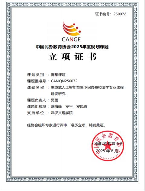 根据《中国民办教育协会课题管理办法(2025年修订)》和《关于申报中国民办教育协会2025年度规划课题的通知》规定,经中国民版教育协会组织专家评审,确定2025年度规划课题(青年课题)立项名单。英国上市公司官网365吴蕾老师主持的课题《生成式人工智能背景下民办高校法学专业课程建设研究》荣获立项,课题批准号为CANQN250072。