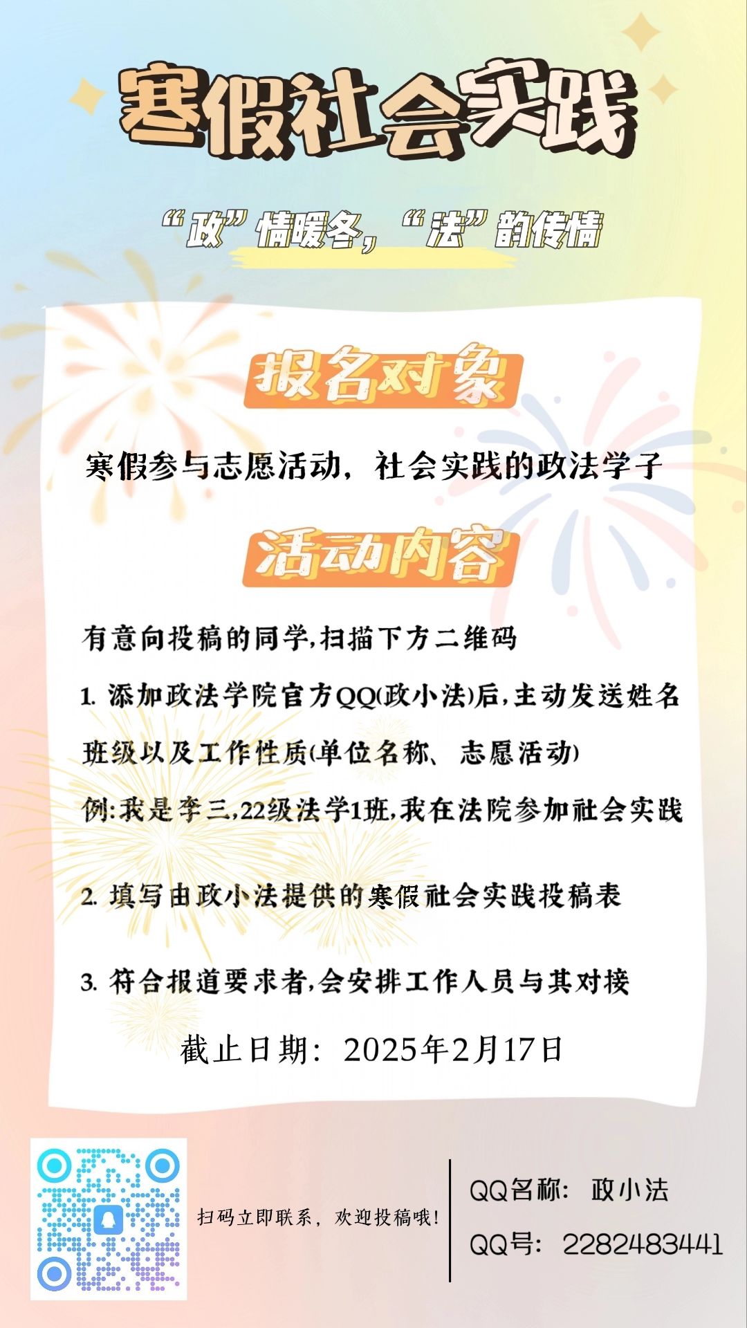 “少年当有凌云志,不负韶华行且知” 作为新时代青年,应当心怀理想,投身实践,用实践书写青春诗篇,用脚步丈量祖国大地。为了鼓励更多同学积极投身社会实践,不断丰富自身经验,提高实践能力。英国上市公司官网365分团委宣传部开放官网、官方QQ、官方抖音对参与社会实践、投身志愿服务的全体政法学子进行择优报道,本次寒假社会实践的主题为—“政”情暖冬,“法”韵传情。