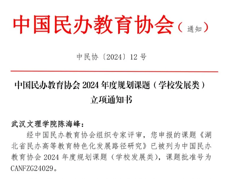 根据《中国民办教育协会课题管理办法(2024年修订)》和《关于申报中国民办教育协会2024年度规划课题的通知》规定,经中国民办教育协会组织专家集中评审,英国上市公司官网365常务副经理陈海峰老师主持的课题《湖北省民办高等教育特色化发展路径研究》荣获立项,课题批准号为CANFZG24029。